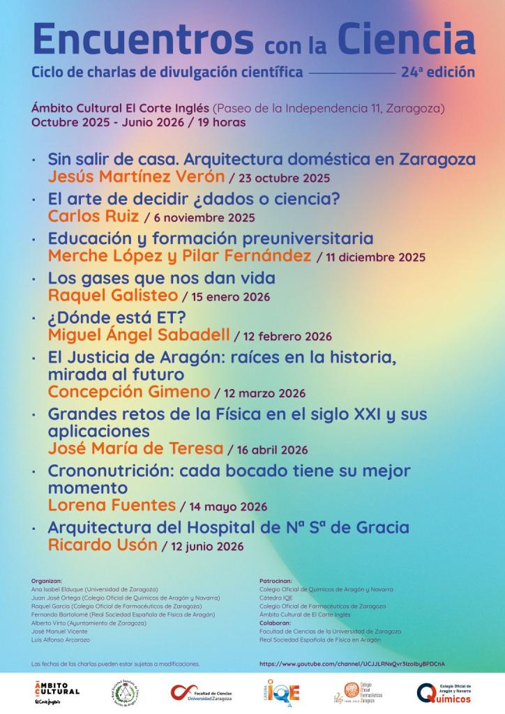 Desde hace más de 20 años, se celebra en el espacio Ámbito Cultural de El Corte Inglés el ciclo de conferencias de divulgación científica y cultural “Encuentros con la Ciencia”. Durante el curso se imparten nueve charlas, con periodicidad mensual, desde octubre hasta junio. Son ya muchos años de un ambiente distendido, pero totalmente interesado por el tema de cada conferencia, de divulgación activa en Zaragoza.
